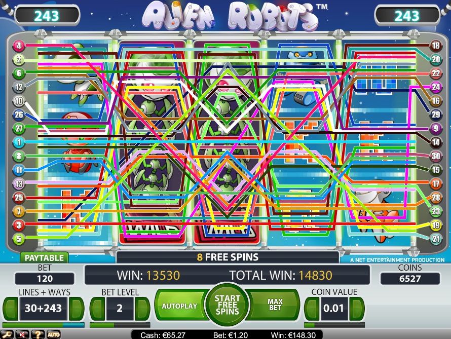 Захватывающий мир роботов, где вас ожидают отменные выигрыши, вы сможете открыть для себя благодаря игровому автомату Alien Robots, в котором игра одновременно ведется по двум группам линий — 30 и 243. Примечательно, что призовые выплаты вы будете получать не только в основной игре, но также в течение фри спинов с бонусными опциями. Важно отметить, что теоретический процент выплат в слоте превышает 96%.